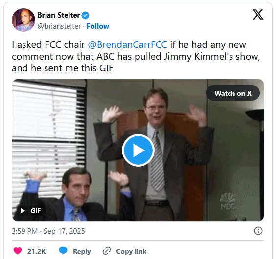 Apparently, the chair of the FCC Brendan Carr was so offended that he went on a podcast with someone named Benny Johnson to complain. (How dare Kimmel suggest that Kirk’s killer came from a Republican family that voted for Trump and the likely is one of them… How is that different from the right wingers continuing to blame the left for this and for ALL POLITICAL VIOLENCE!?!)